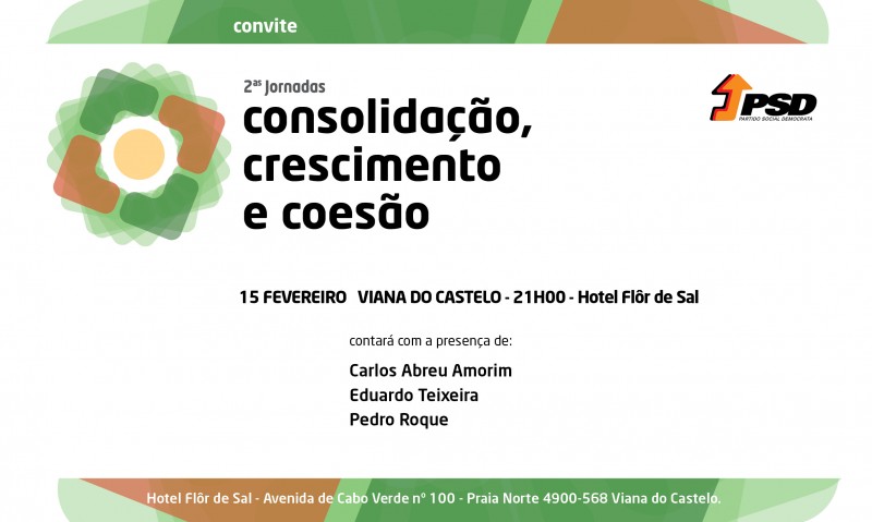 O PSD Alto Minho convida para as 2ªs Jornadas de "Consolidação, Crescimento e Coesão", com a presença de Carlos Abreu Amorim, Eduardo Teixeira e Pedro Roque.